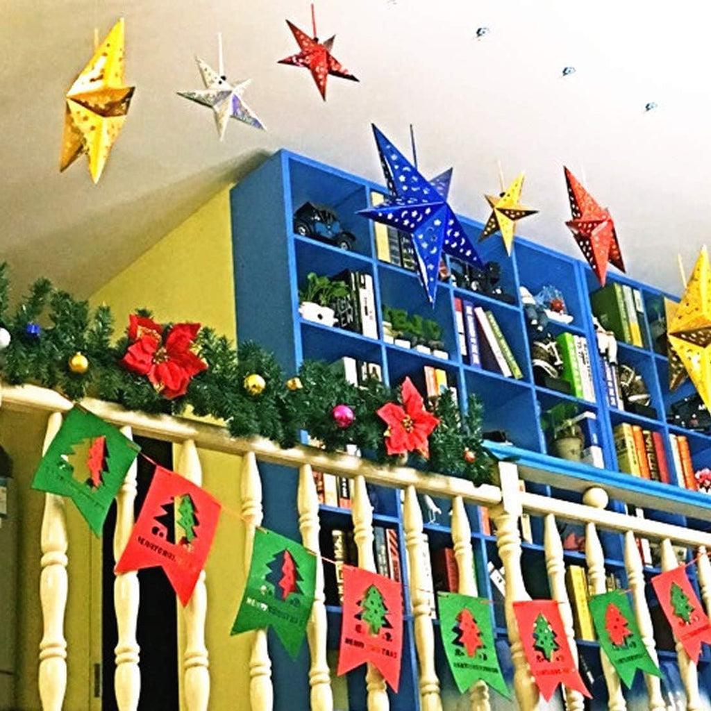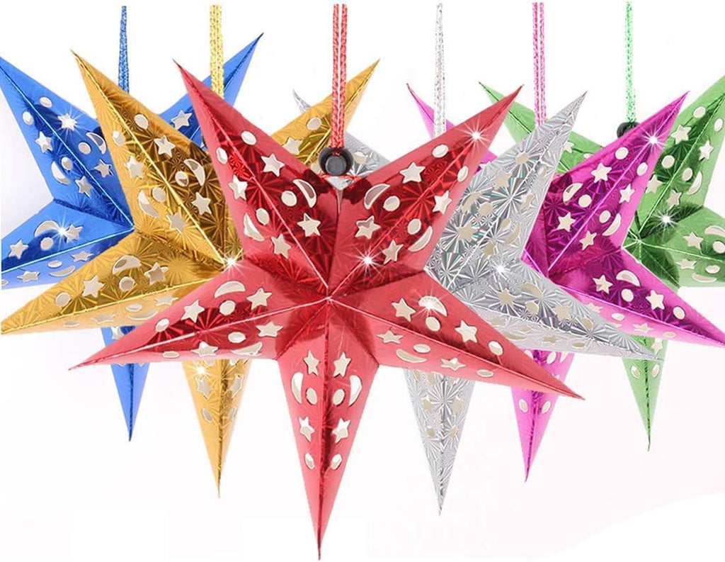 【Multi-Use】Perfect decoration for Christmas,wedding,party,birthday and other celebration activities 【Moon and Star Pattern】Hollow out design with moon and star pattern,you can use some tealights or string lights (not include) to light up the star lantern,beautiful in night. 【With Hanging Cord】Each paper star with hanging cord,it can decoration in any room in the home,you can hanging on wall, ceiling,trees,porch or anywhere you like. 【Material】Made from thick paper,Five-pointed star with many moon and star shaped holes,It could easily be assembled and disassembled, also can be reused. 【Dimension】Wide:4 inch (11cm),total lenght 10inch (24cm),come with 4-5 colors paper star:red, golden, green, slivery, rose pink, blue.